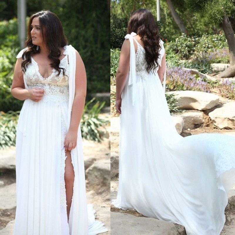Stylish Lace Plus Size Beach Wedding Dresses V Neck Side Split