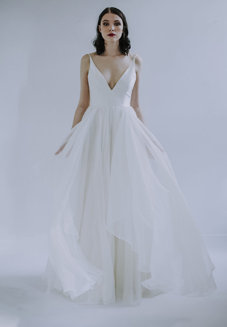 Deep V Neck Tulle Gown White Halter Back Wedding Dress Spaghetti