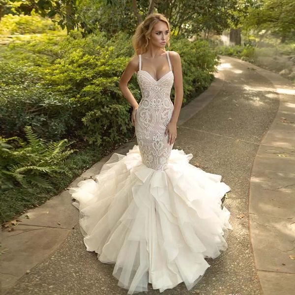 Vintage Spaghetti Strap Lace Bridal Dress Mermaid Open Back Tulle
