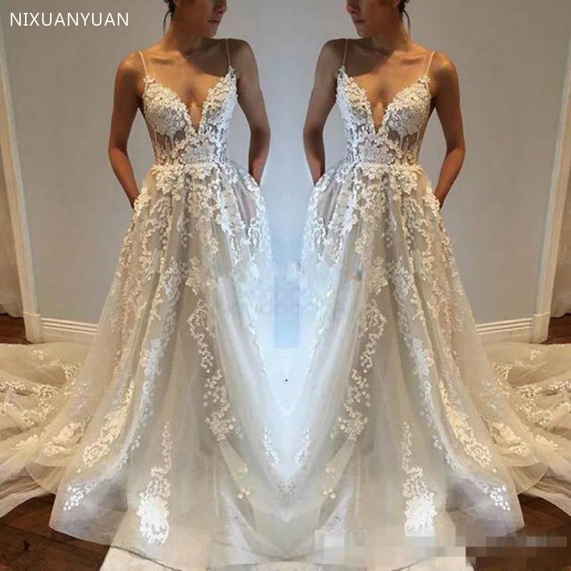 Elegant Sweep Train Backless Wedding Dress With Lace Top Spaghetti