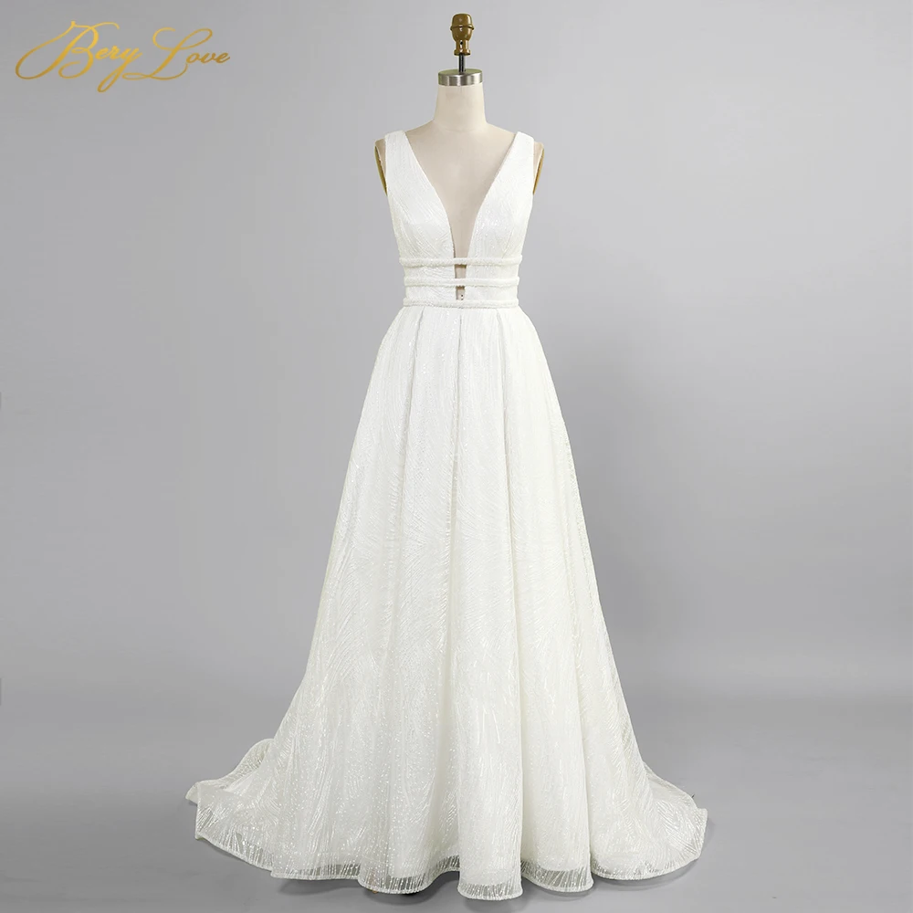White Glitter Wedding Dress 2019 A Line Sexy V Long Bridal Dress