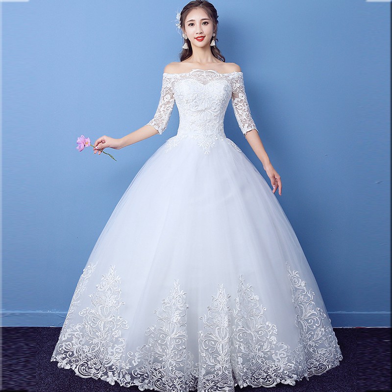 Off The Shoulder White Lace Long Sleeve Wedding Dress Vq