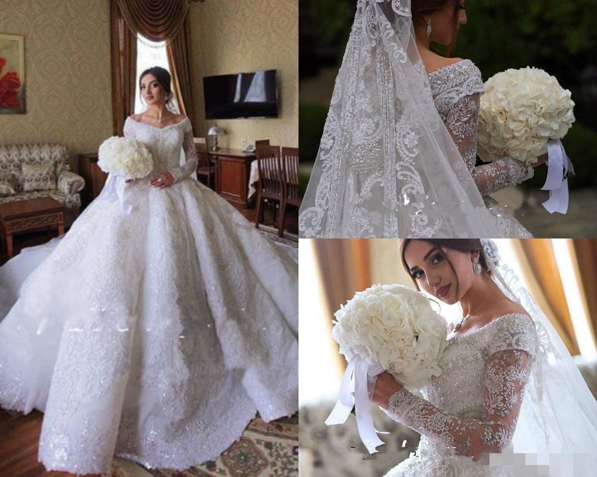 2019 Princess Long Sleeve Lace Wedding Dresses Boat Neck Ball Gown