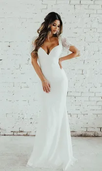Beach Wedding Gowns Short Sleeve V Back Long Bridal Dress V Neck
