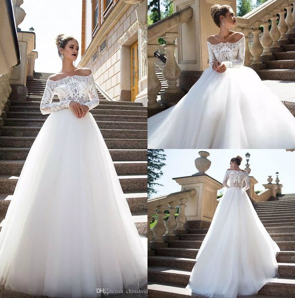 Discount Princess White A Line Wedding Dresses Long Sleeve Lace