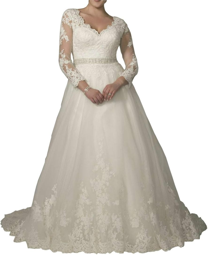 Dreamdress Women S V Neck Lace Long Sleeve Plus Size Wedding Dress