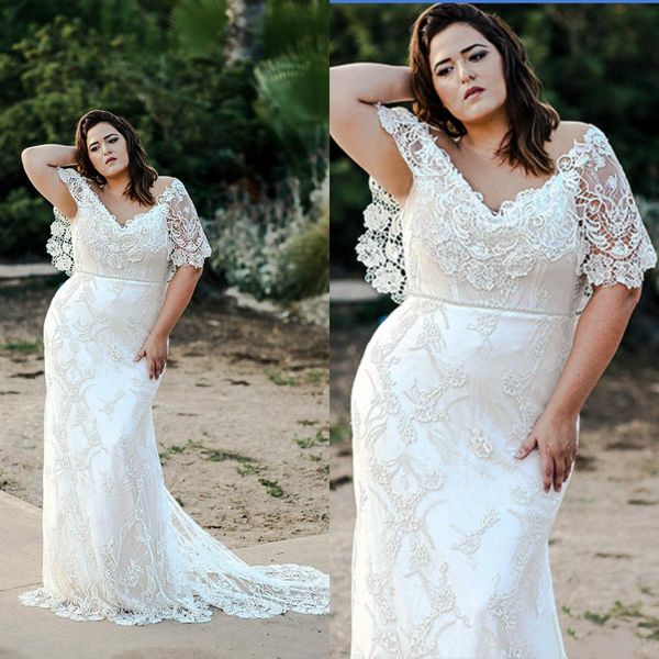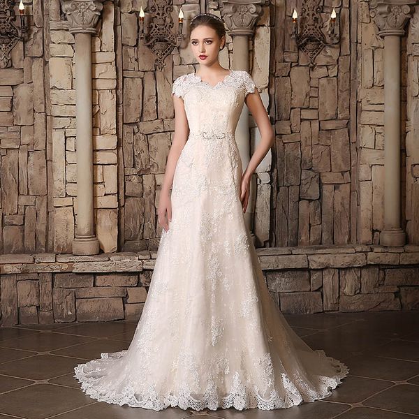 Modest Lace Short Sleeve Mermaid Wedding Dress White Ivory Bridal