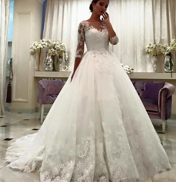 Vintage Beaded Lace Ball Gown Wedding Dresses With 3 4 Long Sleeve
