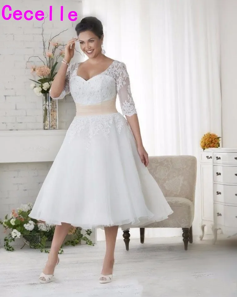 Short Vintage Tea Length Plus Size Modest Wedding Dresses With 3 4