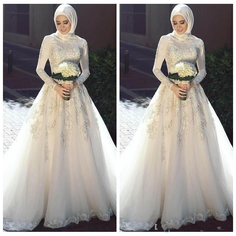 Discount 2019 Modest High Neck Long Sleeves Muslim Wedding Dresses