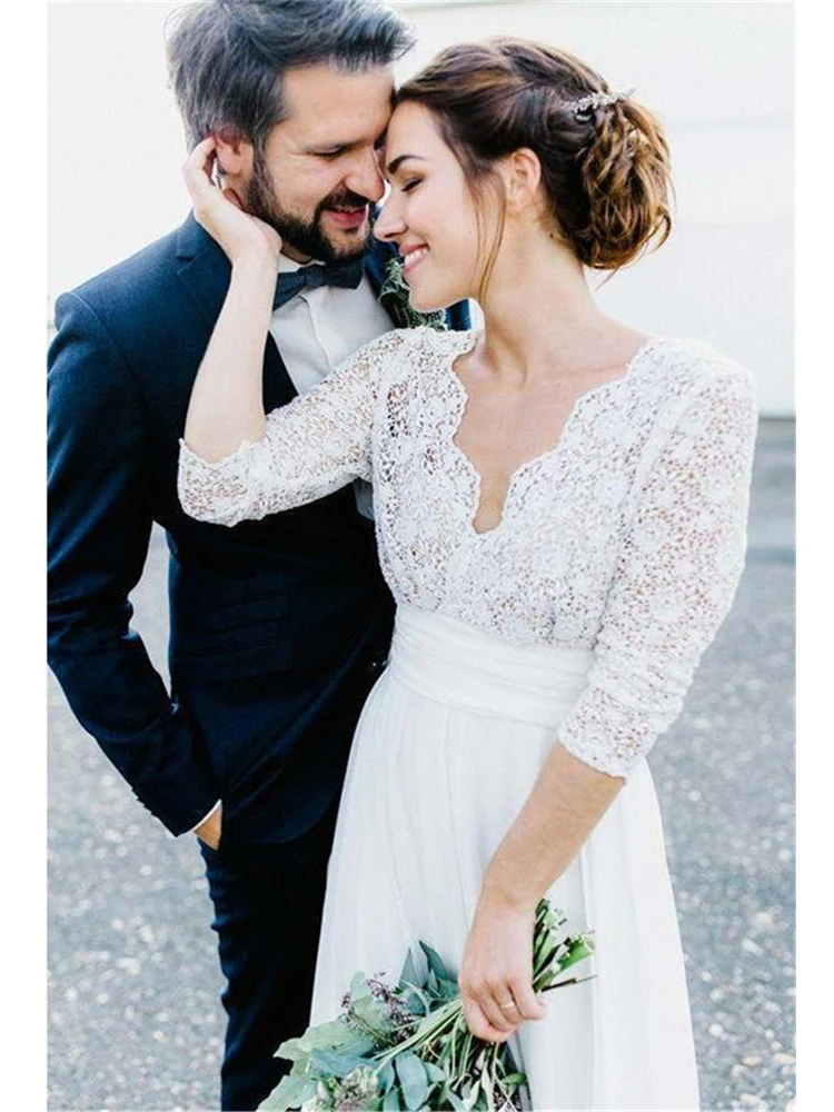 Simple A Line V Neck Open Back Long Sleeves Lace Wedding Dresses