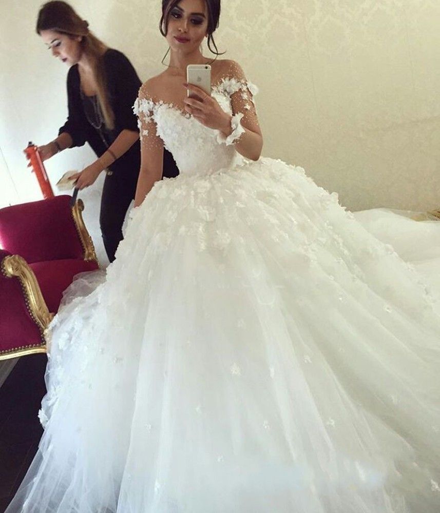 2020 Skin Tulle Long Sleeves Wedding Dress Plus Size Ball Gown