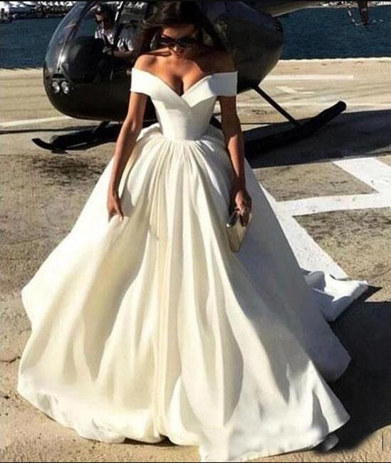 White A Line Off Shoulder V Neck Satin Wedding Dresses Bride Gown