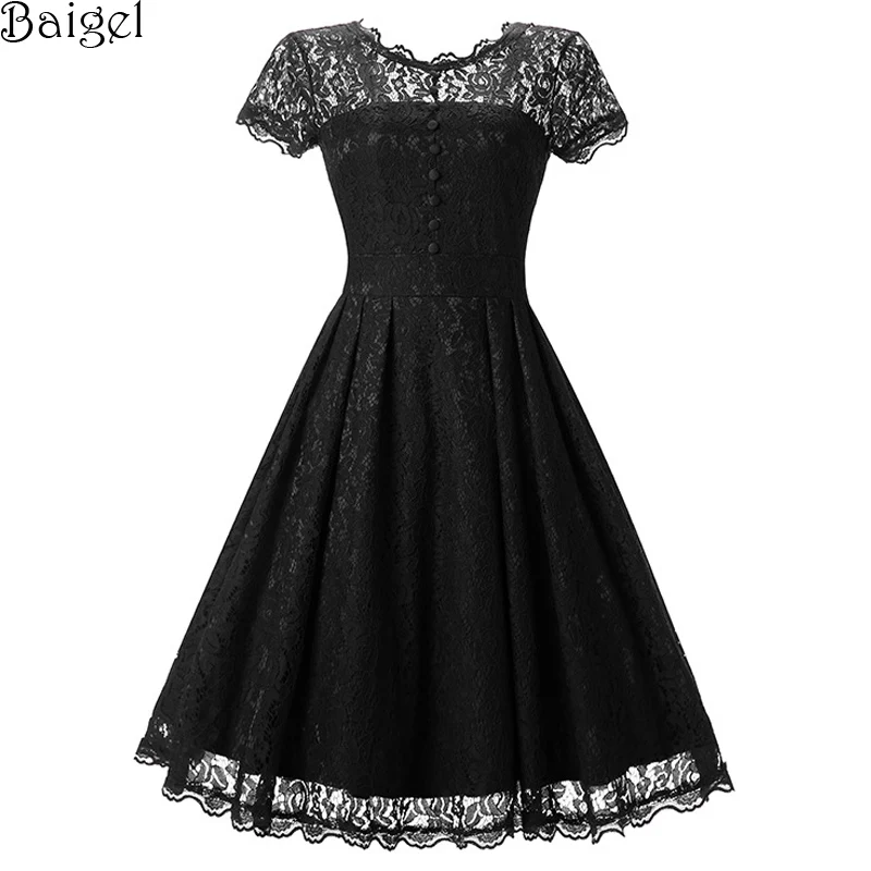 Womens Floral Lace Dress Short Sleeve Burgundy Blue Black Vintage