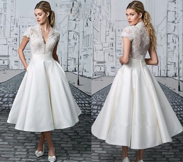 Discount 2020 Vintage Tea Length Wedding Dresses With Pockets V