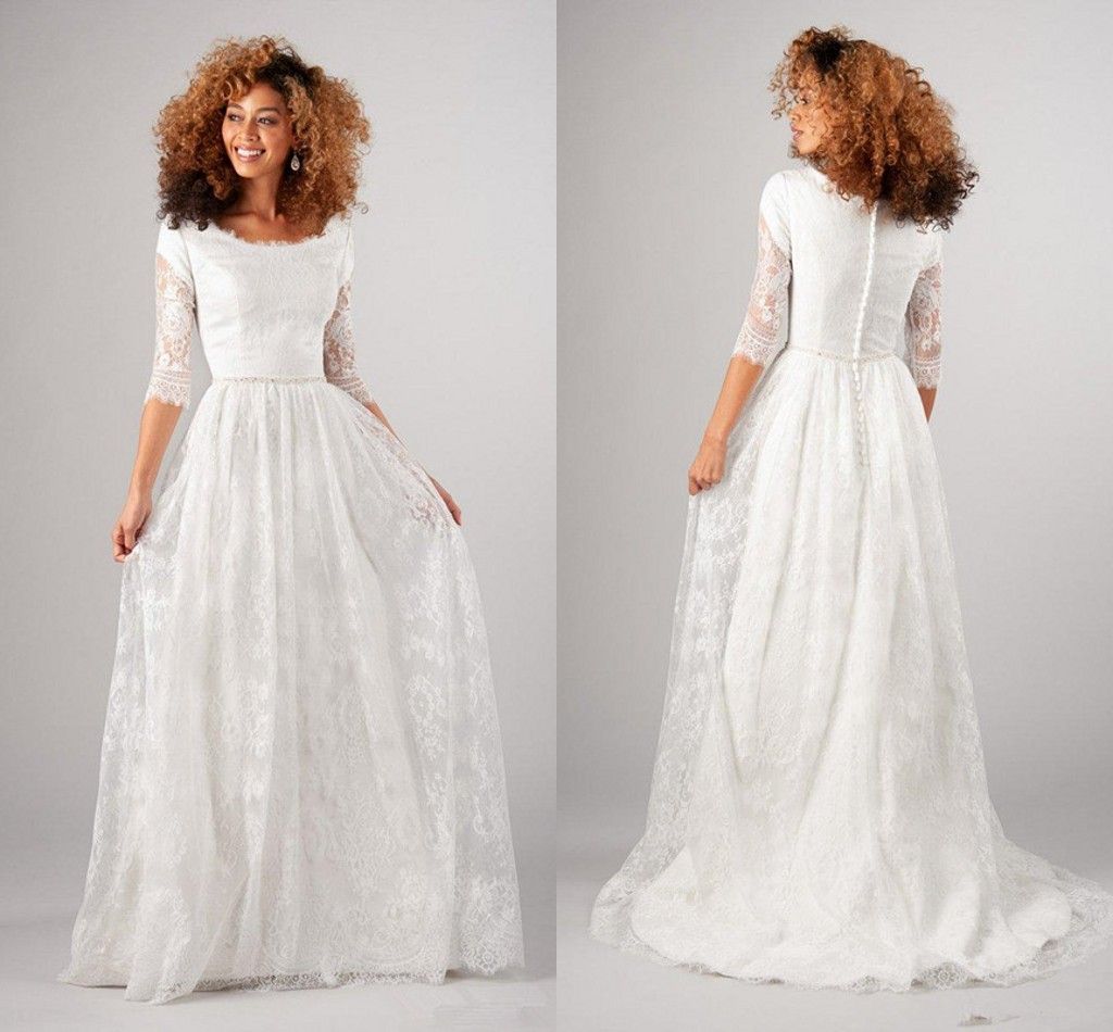 Discount 2019 New Vintage A Line Lace Modest Wedding Dress With 3