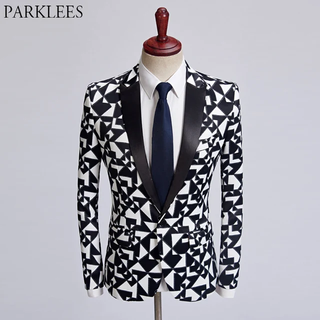 Mens Black White Plaid Blazer Jacket Casual One Button Male Check