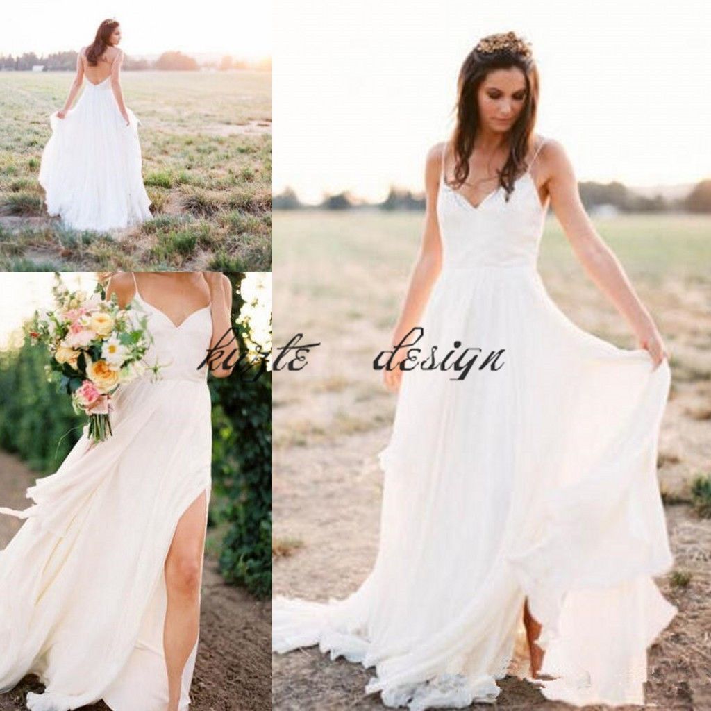 Spaghetti Straps White Long Chiffon Lace Beach Wedding Dresses