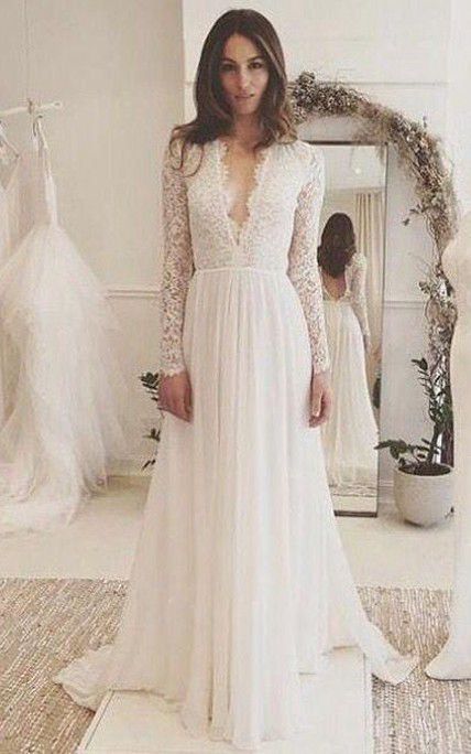 A Line Wedding Gown Features Lace Top Chiffon Skirt V Neck