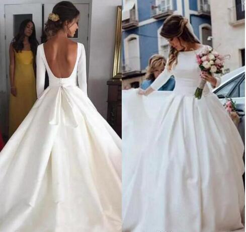 New White Long Sleeves Backless Satin Wedding Dress Bridal Gowns
