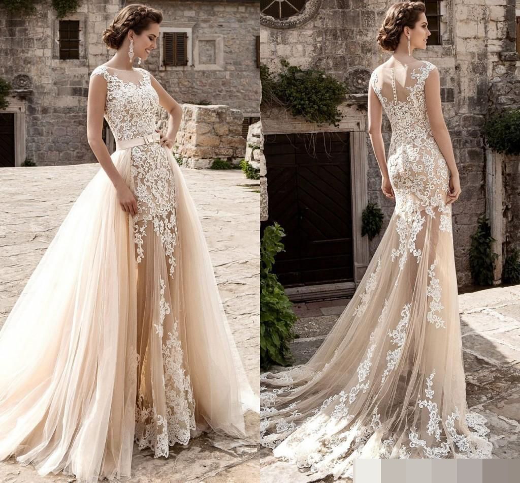 2019 Champagne Wedding Dresses Over Skirts Tulle Mermaid See