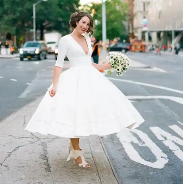 Simple Tea Length Short Wedding Dresses With Sleeves V Neck Sexy