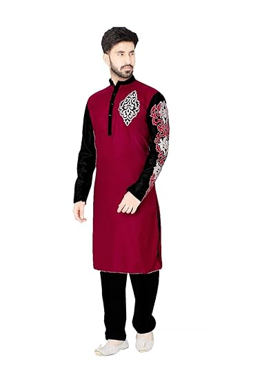 Mens Kurta Pajama Wedding Maroon Black Indian Party Wear Set Of 2