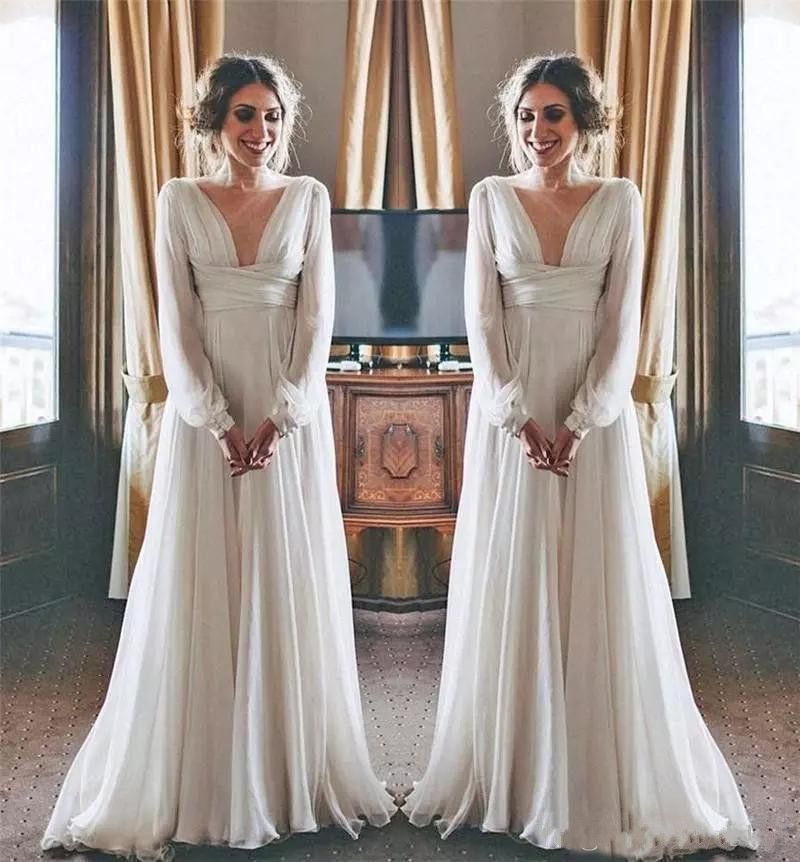 Modest Hippie Boho Beach Wedding Dresses 2019 Long Sleeves V Neck