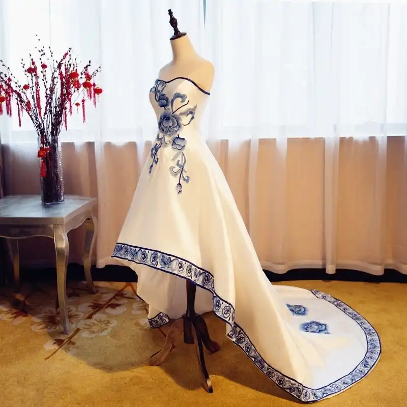 Fashion Tailing Blue And White Porcelain Evening Gown Woman Modern