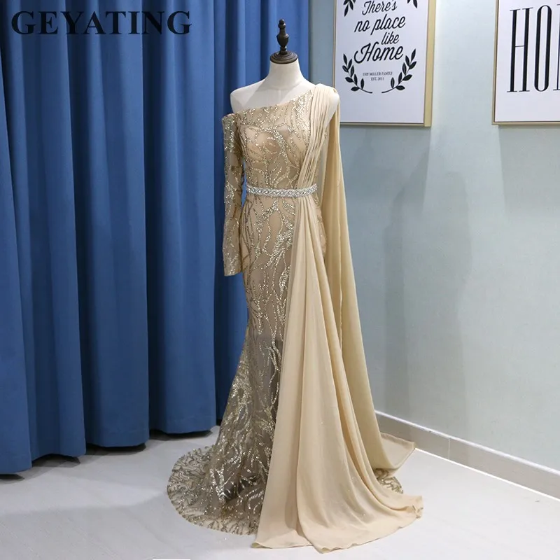Arabic Dubai Evening Dress With Long Sleeve One Shoulder Cape One
