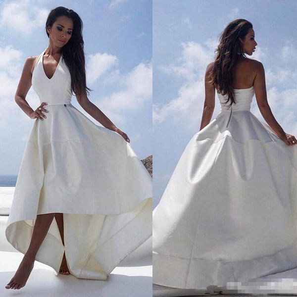 Discount White Satin High Low Beach Wedding Dresses Halter V Neck