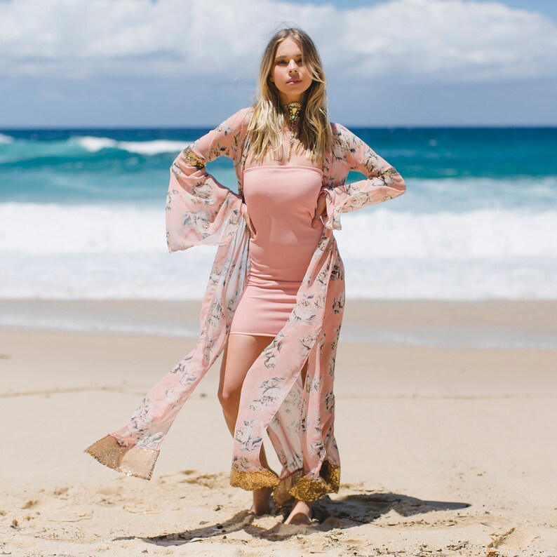 Peach Kimono Floral Kaftan Cape Robe Dress Sequin Beaded Etsy
