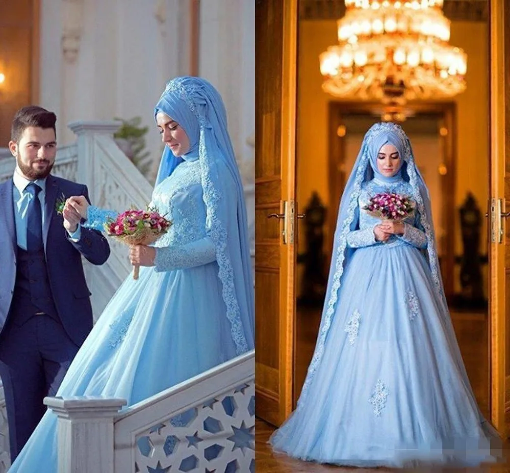 High Quality Long Sleeve A Line Sky Blue Lace Muslim Wedding