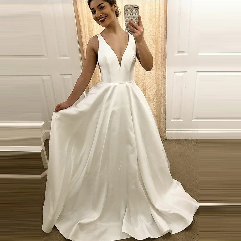 Vestidos De Boda Simple Satin Sexy V Neck Wedding Dress Straps