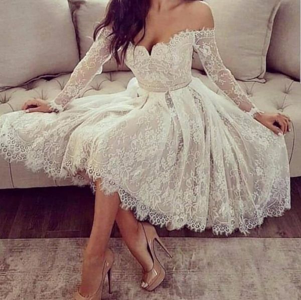 Discount Lace Short Wedding Dresses 2019 Off Shoulder Sheer Long