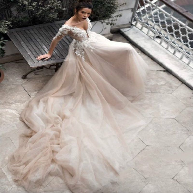 Beautiful Applique Wedding Dresses V Neck A Line Tulle Low Back