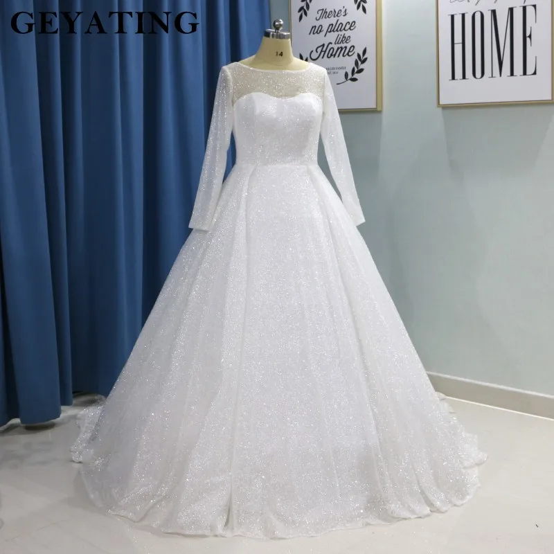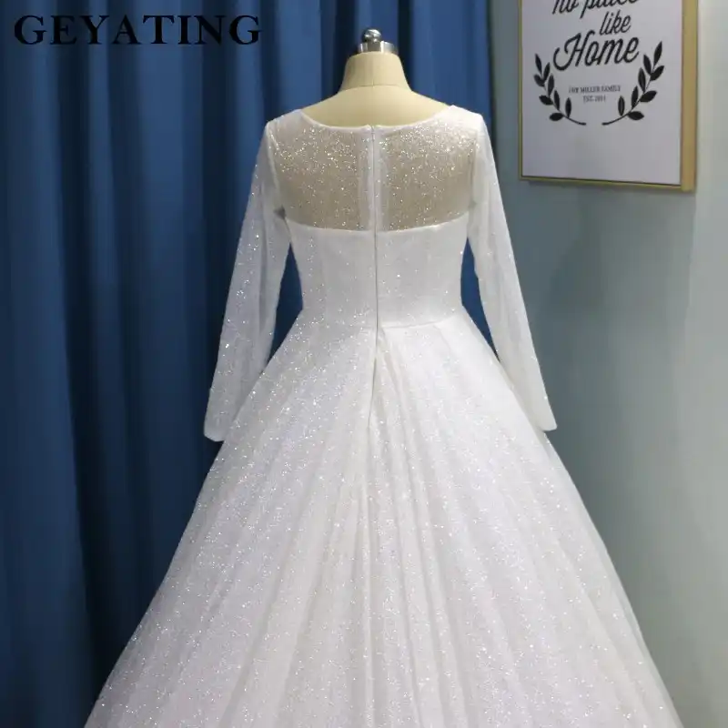 Glitter White Bling Bling Ball Gown Wedding Dress Long Sleeves