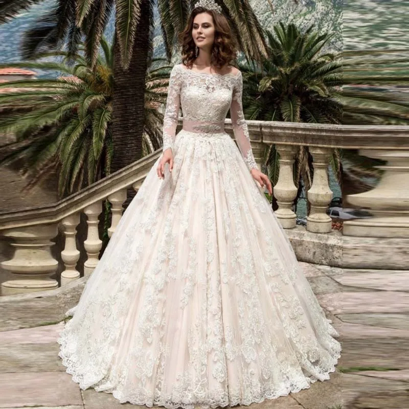 Lace Tulle Long Sleeve Princess Ball Gown Lace A Line Wedding